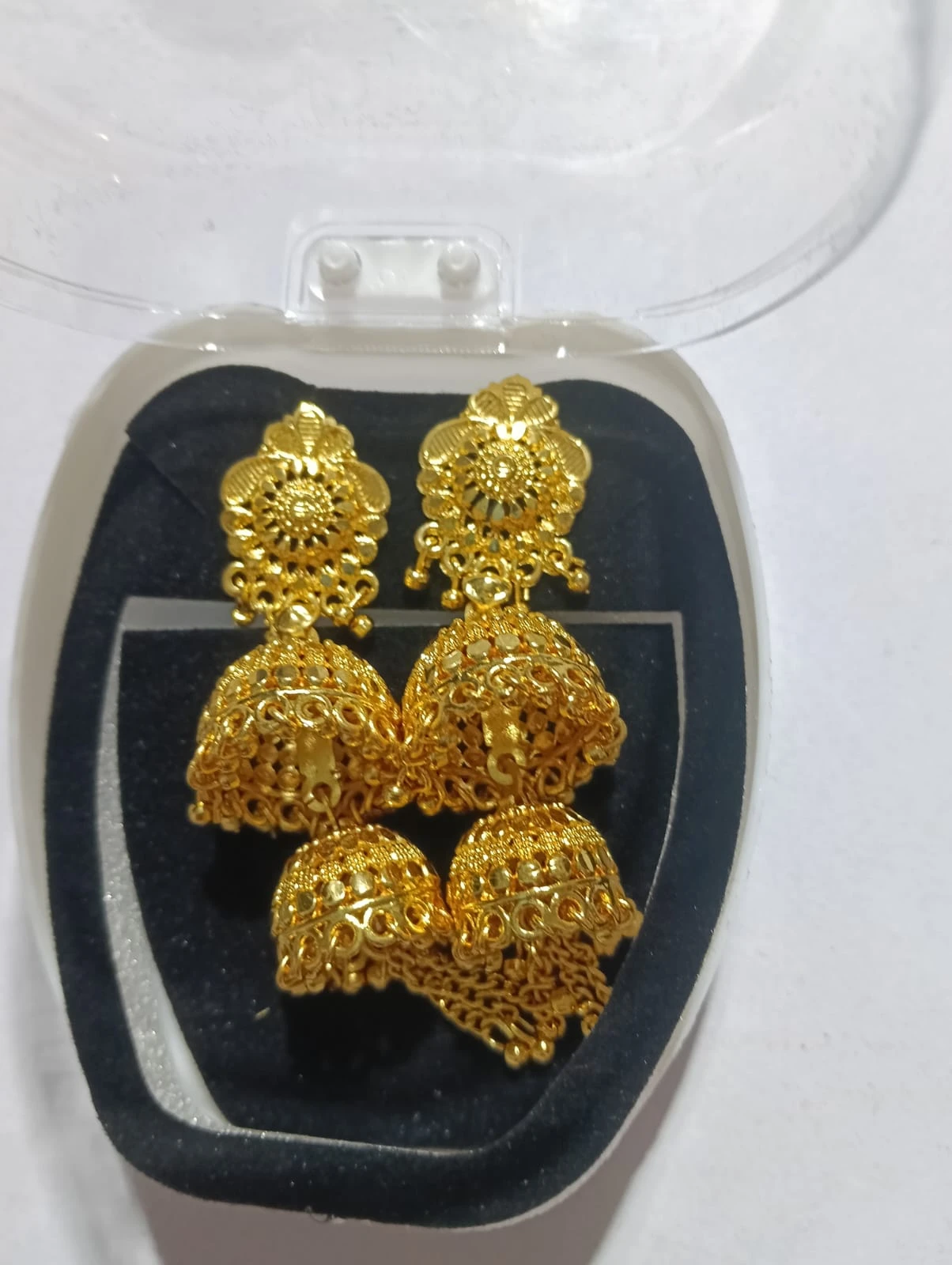 Apne ethnic look ko complete karein in beautiful traditional gold plated jhumka earrings ke saath. Isme diya gaya intricate floral design aur double layer ghunghroo pattern aapko royal aur classy look deta hai.