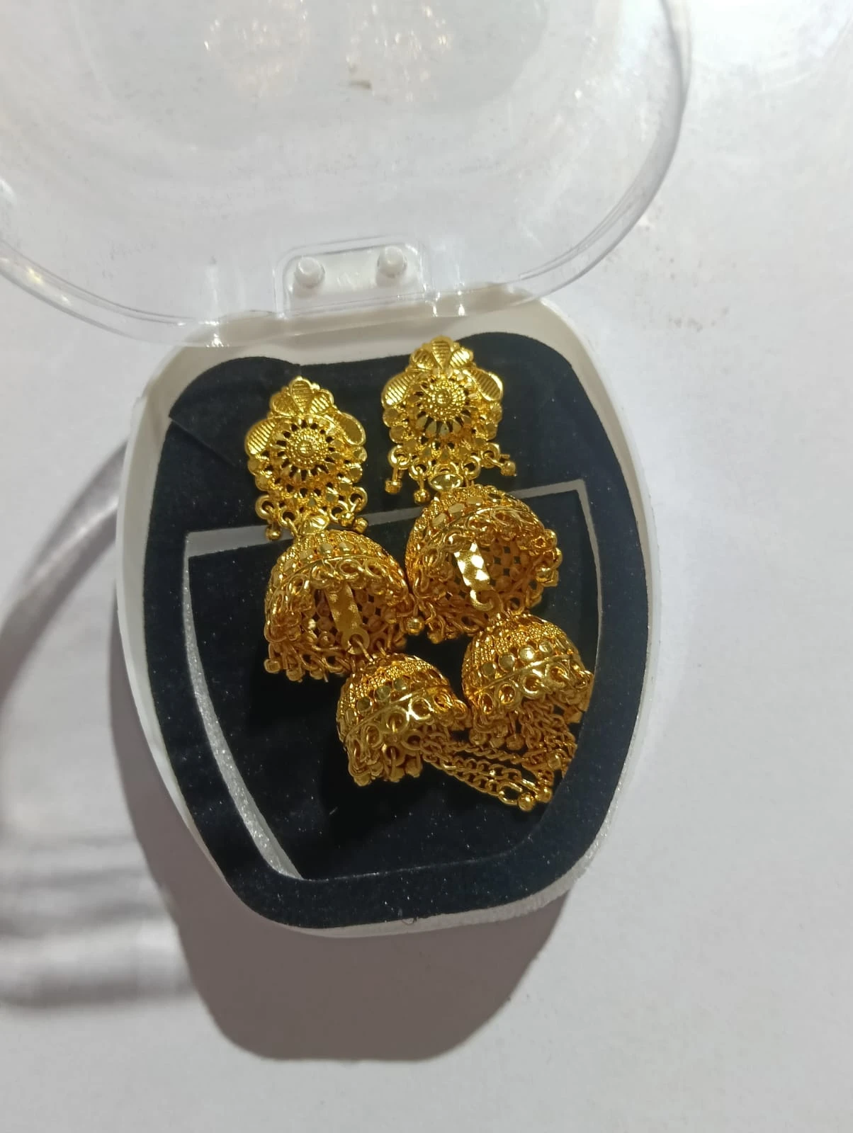 Apne ethnic look ko complete karein in beautiful traditional gold plated jhumka earrings ke saath. Isme diya gaya intricate floral design aur double layer ghunghroo pattern aapko royal aur classy look deta hai.
